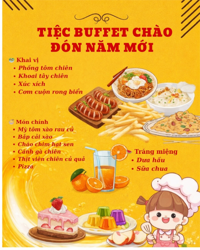 💥 Bữa tiệc buffet được nhà trường chuẩn bị chu đáo với thực đơn phong phú, hấp dẫn, đảm bảo cân đối dinh dưỡng và an toàn vệ sinh thực phẩm, phù hợp với lứa tuổi mầm non. Dưới sự hướng dẫn của giáo viên, các bé được tự tay lựa chọn món ăn yêu thích và cùng nhau thưởng thức trong không gian thân thiện, ấm áp.