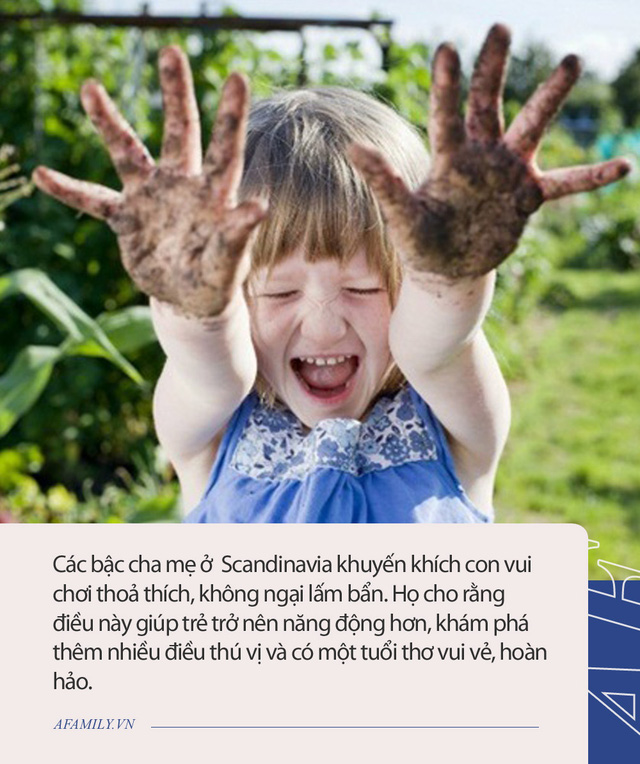 Ở nhiều nước, bố mẹ thường yêu cầu con phải giữ quần áo sạch sẽ và không được nghịch bẩn thì tại bán đảo Scandinavia lại khác. Các bậc cha mẹ ở đây khuyến khích con vui chơi thoả thích, không ngại lấm bẩn. Họ cho rằng điều này giúp trẻ trở nên năng động hơn, khám phá thêm nhiều điều thú vị và có một tuổi thơ vui vẻ, hoàn hảo.