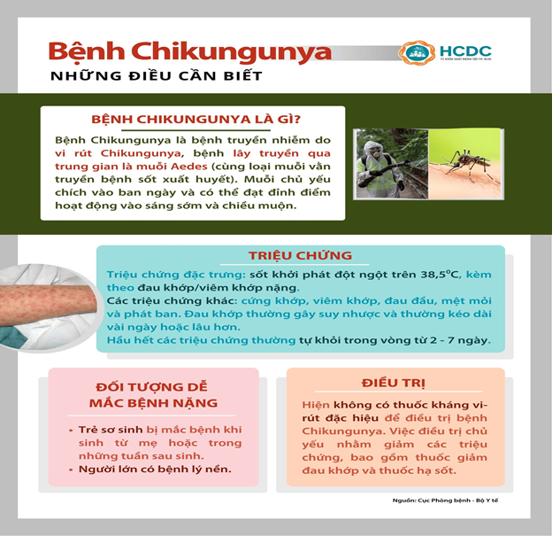 Bệnh Chikungunya là một bệnh do virus gây ra, lây truyền chủ yếu qua muỗi Aedes, cùng loại muỗi truyền bệnh Sốt xuất huyết và Zika. Bệnh có thể gây tử vong nếu nặng; có thể để lại di chứng kéo dài, ảnh hưởng nghiêm trọng đến chất lượng cuộc sống.