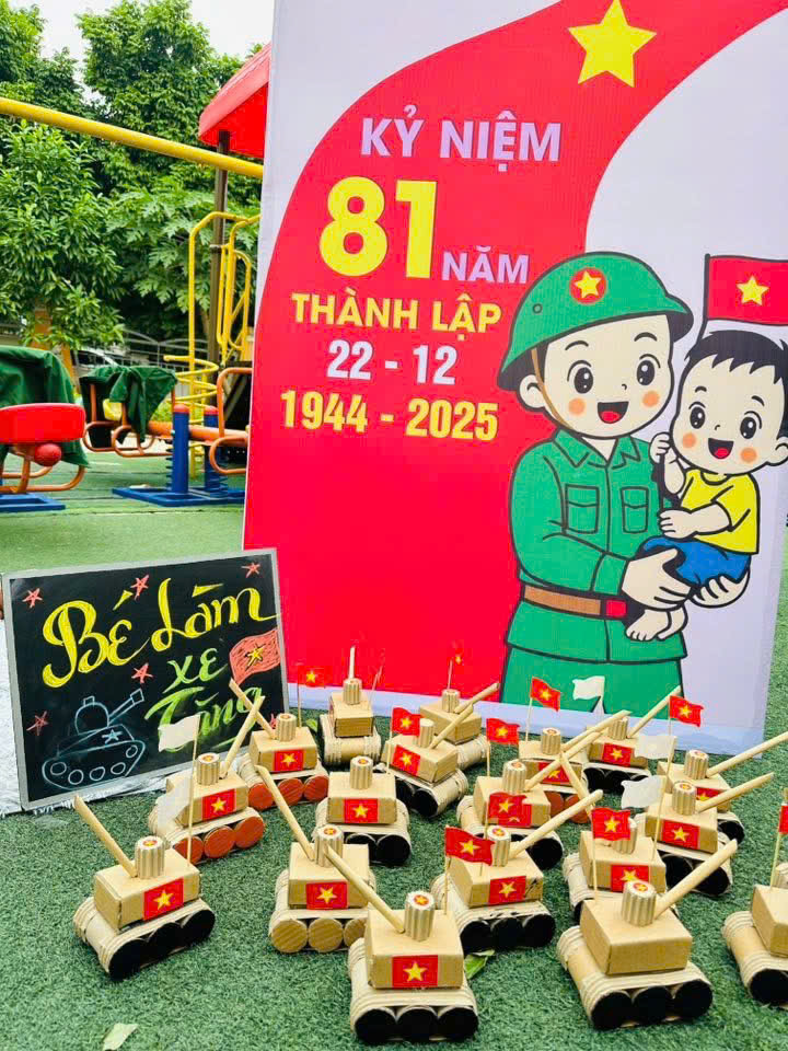 Thông qua hoạt động tạo hình làm xe tăng, các bé được rèn luyện sự khéo léo của đôi tay, phát huy trí tưởng tượng và khả năng sáng tạo. Đồng thời, các con còn được làm quen với hình ảnh người lính Bộ đội Cụ Hồ – biểu tượng của tinh thần kỷ luật, đoàn kết và lòng dũng cảm.