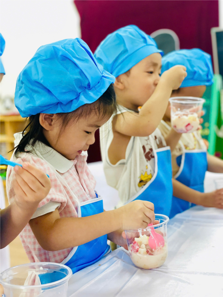 Trong khi các em ở lớp nhỏ dùng muỗng xúc các nguyên liệu (đã được cô giáo cắt