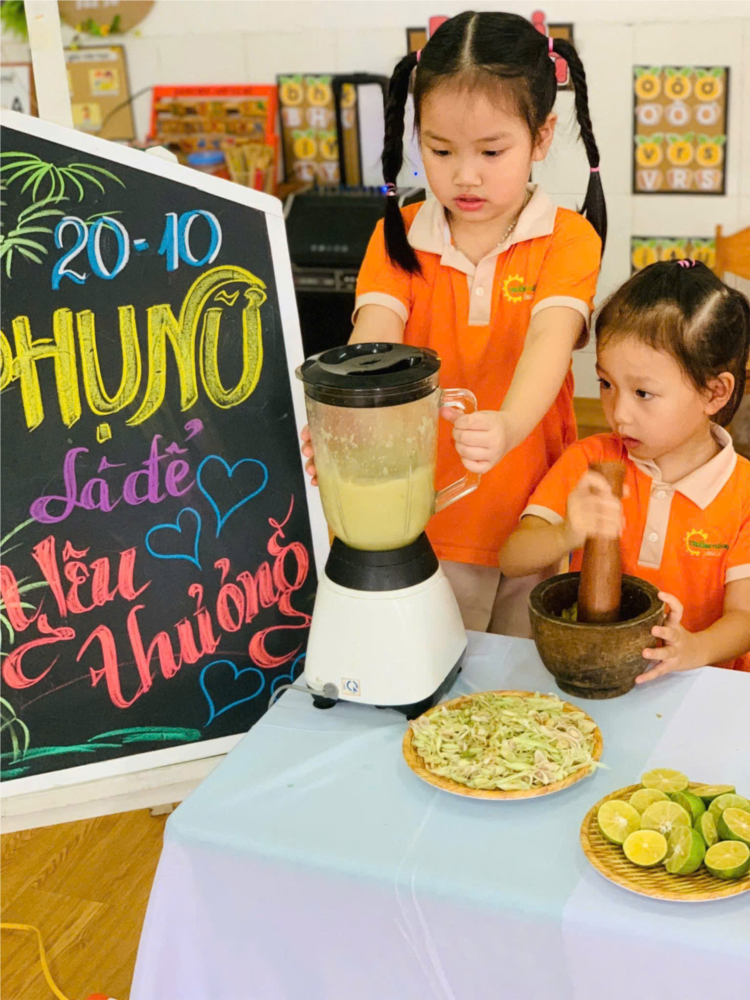 Các con được tìm hiểu về những nguyên liệu hoàn toàn từ thiên nhiên như: gừng, sả, chanh, vỏ bưởi, cánh hoa hồng, muối hột… các bạn nhỏ đã cùng nhau rửa – giã – pha chế – và đóng chai nước ngâm chân một cách tỉ mỉ và đầy yêu thương.