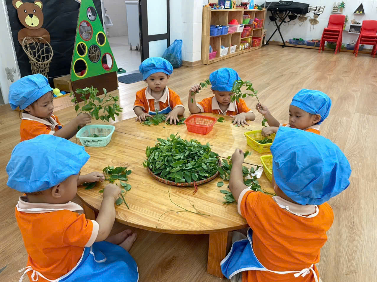Hoạt động nhặt rau ngót là một trải nghiệm thú vị và bổ ích dành cho trẻ em trong độ tuổi 2–3. Với đôi bàn tay nhỏ xinh, các bé được tự mình tách từng lá rau khỏi cành, cảm nhận được sự mềm mại, mùi thơm nhẹ nhàng của rau ngót tươi. Thông qua hoạt động này, trẻ không chỉ rèn luyện sự khéo léo và khả năng tập trung, mà còn học được cách nhận biết rau xanh – một phần quan trọng trong thực phẩm hàng ngày. Đây cũng là dịp để các bé làm quen với khái niệm “giúp đỡ công việc gia đình” một cách nhẹ nhàng và vui vẻ. Hoạt động tuy đơn giản nhưng mang lại nhiều giá trị giáo dục, góp phần phát triển kỹ năng sống cho trẻ ngay từ những năm đầu đời. Hãy cùng ngắm nhìn các các Đầu bếp nhí tý hon của chúng ta nhé!!