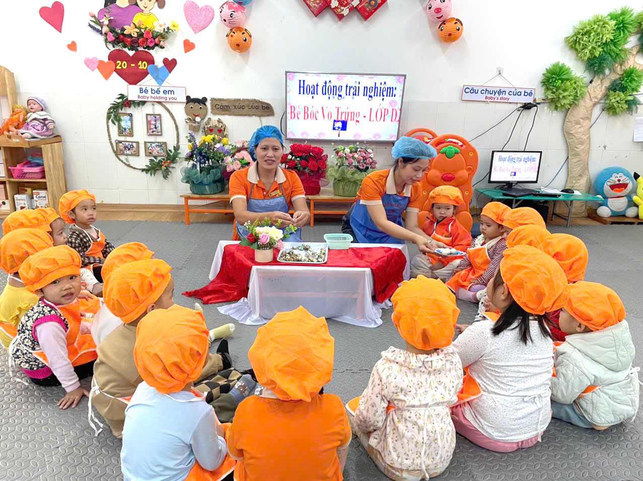 Ngay từ đầu hoạt động, cô giới thiệu cho trẻ về quả trứng, cho các bé quan sát, cầm nắm và cảm nhận độ cứng của vỏ trứng. Sau đó, cô làm mẫu cách gõ nhẹ để nứt vỏ và hướng dẫn trẻ bóc từng mảnh nhỏ. Các bé lớp D2 rất hào hứng, chăm chú quan sát và vui vẻ thử làm theo. Nhiều bé thích thú reo lên khi thấy quả trứng trắng dần hiện ra. Những trẻ còn gặp khó khăn được cô nhẹ nhàng hỗ trợ và động viên, giúp các con cảm thấy yên tâm và tự tin hơn. Khi hoàn thành, trẻ được thưởng thức quả trứng do chính mình bóc, tạo cảm giác tự hào và hứng thú. Hoạt động không chỉ rèn vận động tinh, kỹ năng tự phục vụ mà còn giúp trẻ phát triển cảm xúc tích cực khi đi học, yêu thích đến lớp và mạnh dạn tham gia vào các hoạt động. Đây là trải nghiệm vừa gần gũi vừa ý nghĩa đối với các bé lớp nhà trẻ D2.