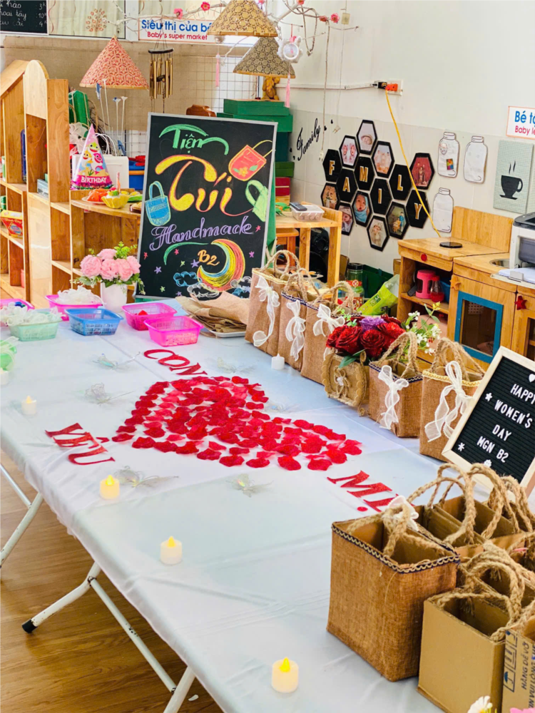 Để tỏ lòng biết ơn, tri ân các bà , các mẹ, các cô… trẻ đã tự tay trang trí những tấm thiệp đầy màu sắc, trang trí váy cho mẹ, làm những bông hoa thật đẹp và trang trí khung ảnh, làm hoa, làm túi, cắm hoa, tự chọn những lời chúc ý nghĩa gửi lời yêu thương, tham gia tích cực hoạt động lời con muốn nói .. Với những nguyên liệu đơn giản, gần gũi, thân thiện với môi trường như giấy bìa, giấy màu, kéo, bút màu, keo dán… các con đã tự tay làm những món quà thật đẹp và ý nghĩa để dành tặng cho các bà, các mẹ và cô giáo của mình. Món quà của các con tuy đơn giản nhưng được làm bằng cả tấm lòng, bằng cảm xúc ngây thơ đáng yêu biết bao. Và hơn hết, đó là món quà các con tự tay trang trí, tuy còn vụng về, non nớt, chưa được khéo léo như nhưng đó là hết thảy tình cảm yêu thương, chân thành, cảm động nhất các con dành cho những người phụ nữ của mình.