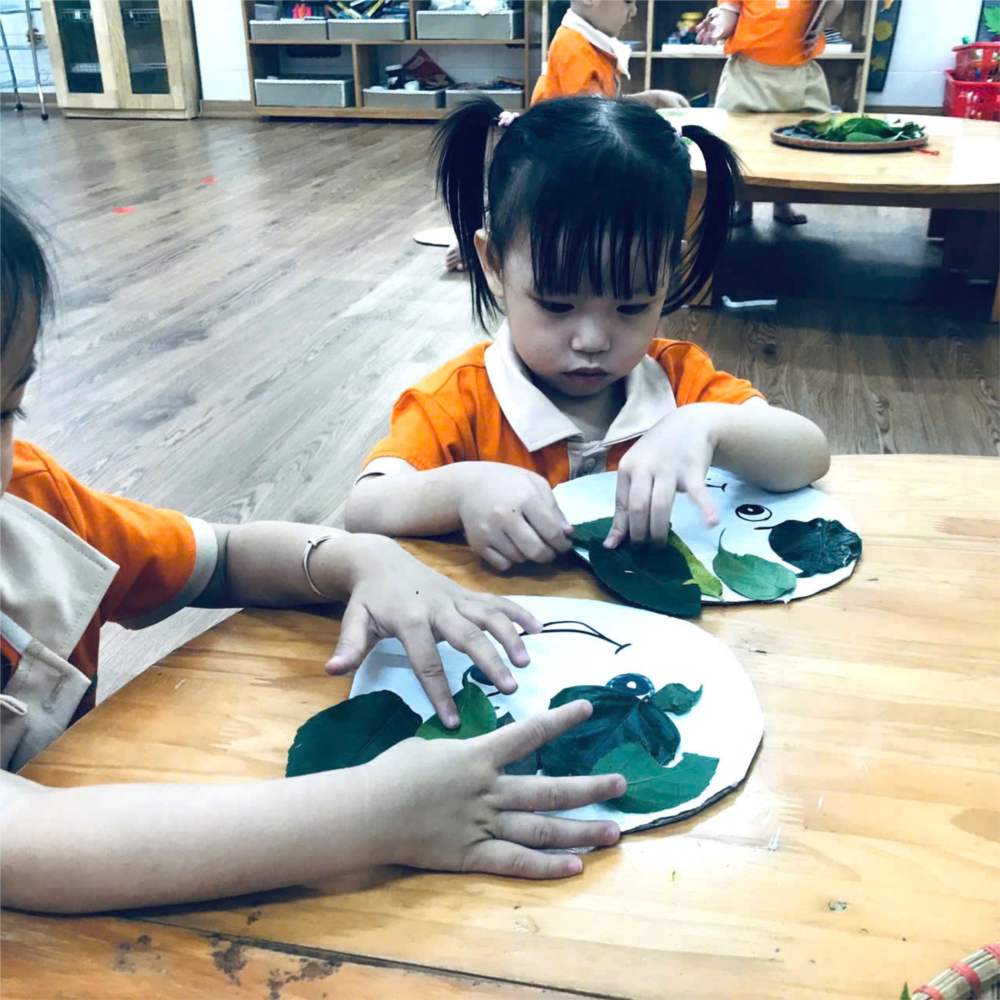 Sau khi thu thập đủ lá cây, các bé quay trở lại lớp học và bắt đầu thực hiện những bức tranh mùa thu của mình. Với sự hướng dẫn của giáo viên, các bé đã dùng lá cây để tạo tóc cho bạn thật dễ thương. Những chiếc lá khô giòn trở nên sống động trong bức tranh của trẻ. Các bé cũng được khuyến khích sử dụng màu sắc để tô điểm thêm cho tác phẩm của mình.