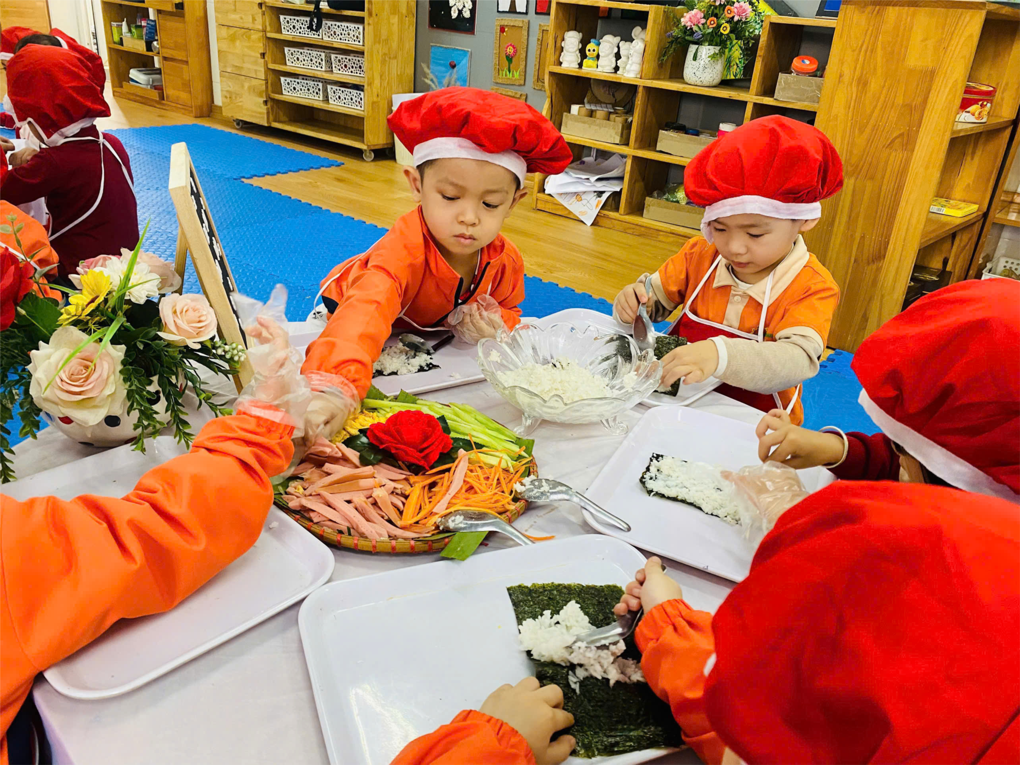 Với những nguyên liệu được các cô chuẩn bị như: lá rong biển, cơm, trứng rán, xúc xích, cà rốt. Dưới sự hướng dẫn của các cô, đôi bàn tay bé nhỏ của bé đã tự mình làm ra những cuốn cơm màu sắc và đầy đủ chất dinh dưỡng. Các bé được tự tay làm nên đều thích thú khi tự mình trải nghiệm và thưởng thức rất ngon lành.