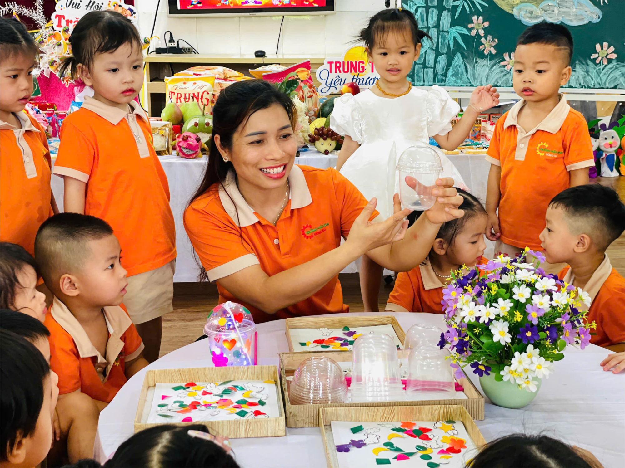 Những bàn tay bé xíu thoăn thoắt cắt – dán – trang trí, bạn nào cũng tập trung hết sức, chẳng khác gì “nghệ nhân nhí”. Mỗi chiếc đèn lồng đều mang màu sắc riêng, có chiếc thì rực rỡ, có chiếc lại đáng yêu hết nấc, nhìn mà chỉ muốn “ôm về treo ngay”! Thêm vào đó bé còn thắp đèn cho những chiếc đèn phát sáng lấp lánh và lung linh. Không chỉ rèn luyện sự khéo léo, hoạt động còn giúp các bạn nhỏ thêm yêu thích những giá trị truyền thống và tự hào với thành quả do chính mình tạo nên.