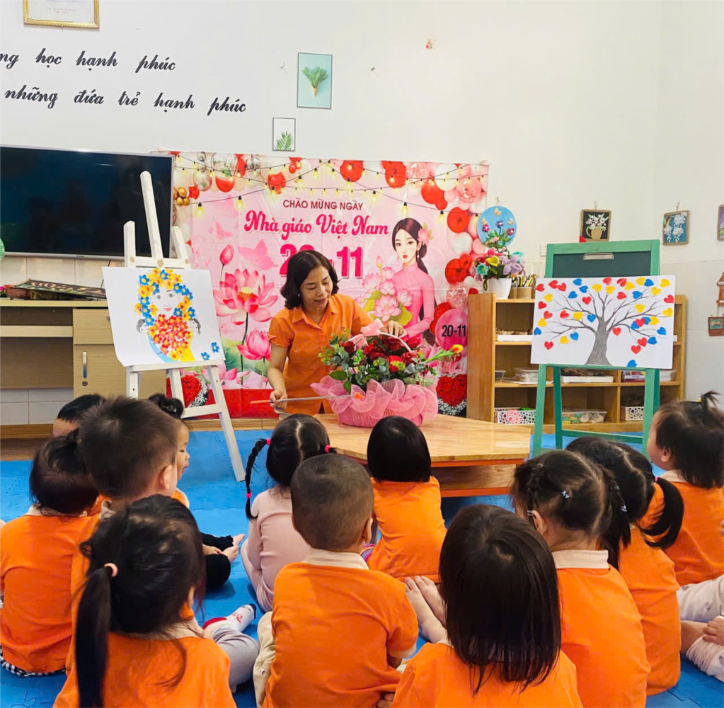 Những trái tim đủ màu sắc được các con nhẹ nhàng dán lên “cây”. Mỗi trái tim là lời chúc, là niềm vui và là sự yêu thương mà các bé muốn trao gửi đến cô trong ngày đặc biệt.