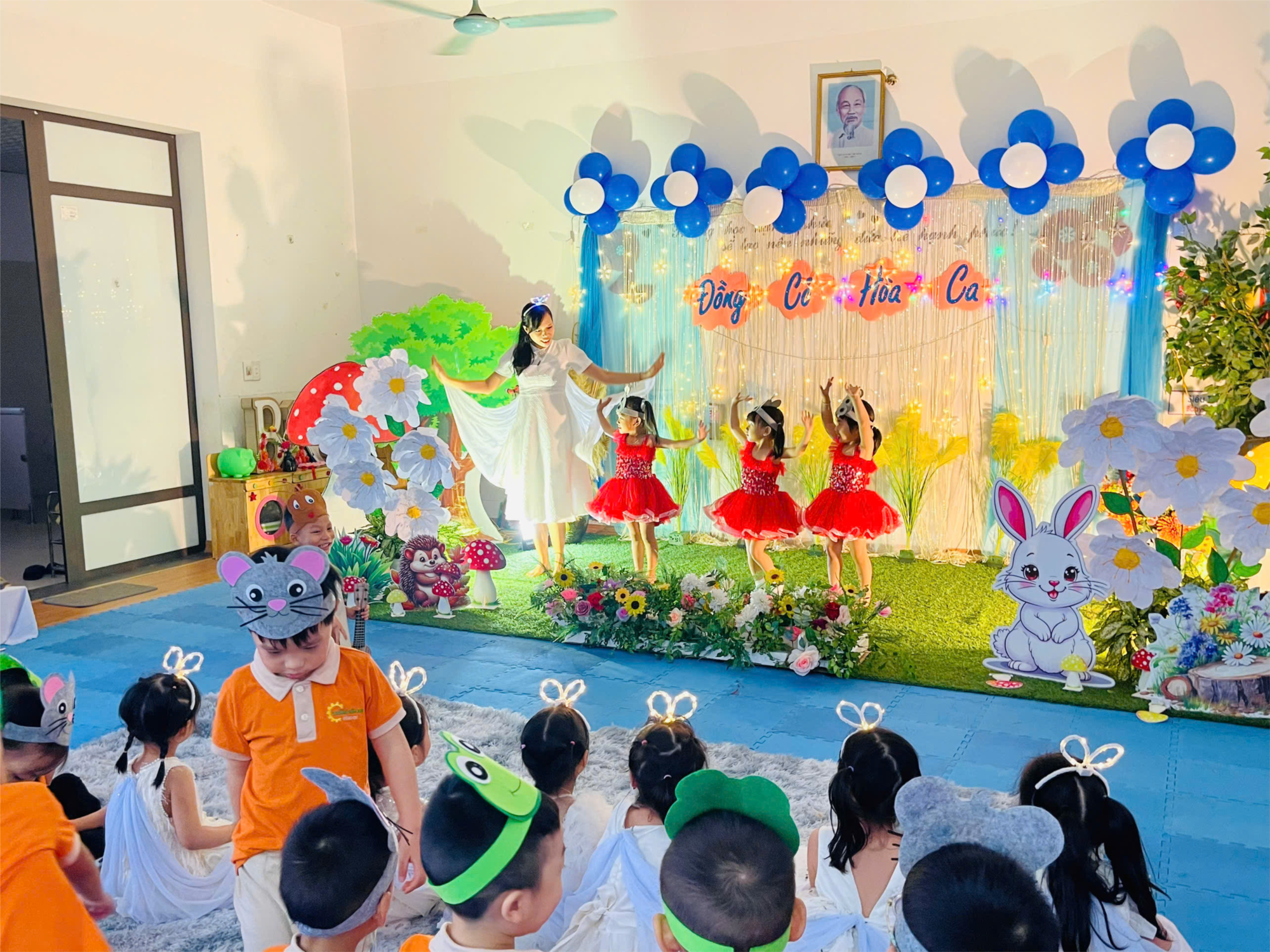 Với hoạt động Làm quen văn học Truyện "Đồng cỏ hòa ca" là tiết học được các bạn nhỏ rất thích thú bởi không những câu chuyện mang đến những tình tiết thú vị xem lần lâm nhạc và lời kể thì các bạn nhỏ còn được truyền cảm bởi giọng kể ấm áp phối hợp từ hai cô. Đây là sự cố gắng rất nhiều của các cô giáo lớp B1. Vở nhạc kịch Đồng cỏ hòa ca được kết thúc bằng những tiếng cười giòn tan và sảng khoái của trẻ. Cùng chúc cô và trò B1 đạt được thành tích cao nhé.