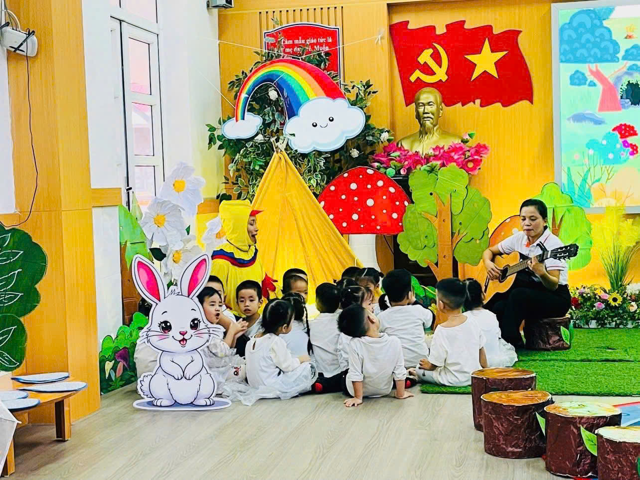 Với việc chuẩn bị đồ dùng chu đáo, cùng các hoạt động sáng tạo, các bạn nhỏ lớp MGB C2 đã có một tiết học vô cùng bổ ích nhằm phát triển khả năng âm nhạc cho trẻ!! Phát huy thế mạnh sở trường là âm nhạc 2 cô giáo lớp C2 đã mang các bạn nhỏ đến hoạt động âm nhạc vô cùng hấp dẫn. Bên cạnh đó, anh gà Trống đáng yêu đã tăng thêm phần giúp các bạn nhỏ của chúng ta hoàn thành các nhiệm vụ âm nhạc. Sự gần gũi trìu mến của 2 cô giáo đã giúp các bạn nhỏ mạnh dạn tự tin tham gia vào các hoạt động.