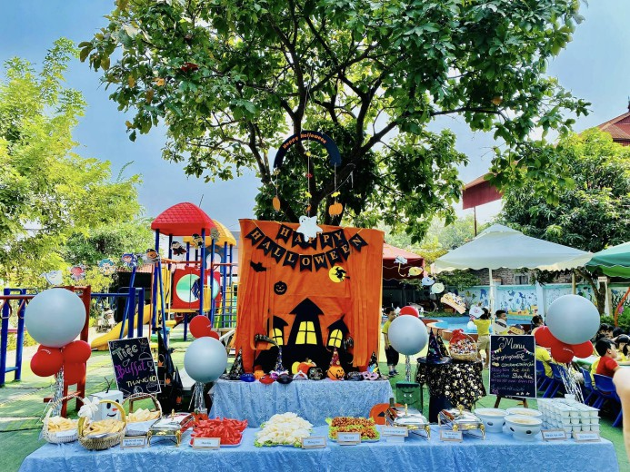 Không khí Halloween tràn ngập khắp trường mầm non Đông Dư. Ngoài các hoạt động Trick or treat, thời trang Halloween...các con được tham gia tiệc Buffet ngoài trời vô cùng thích thú