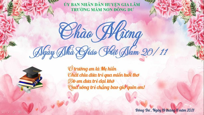 Hoà chung với khí thế tưng bừng, phấn khởi của ngành giáo dục cả nước kỉ niệm 39 năm ngày nhà giáo Việt Nam (20/11/1982 - 20/11/2021). Thực hiện kế hoạch năm học và được sự đồng ý của Đảng ủy xã Đông Dư, PGD huyện Gia Lâm. Ngày 19/11/2021 vừa qua, Trường mầm non Đông Dư long trọng tổ chức “Chương trình Mít tinh chào mừng ngày nhà giáo Việt Nam 20-11” dưới hình thức Online.