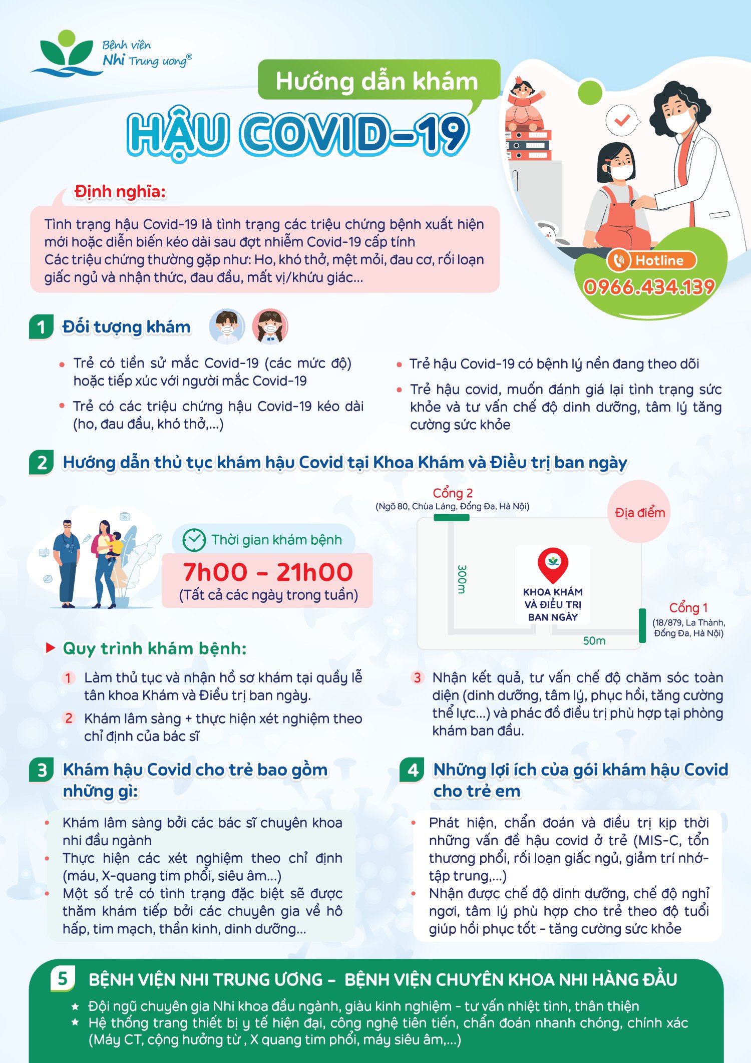 Ngoài ra, dù trẻ không có các triệu chứng nghi ngờ của hậu COVID-19, cha mẹ có thể đưa trẻ tới khám bác sĩ nhi khoa vào khoảng thời gian 4 - 12 tuần sau mắc COVID-19 để được kiểm tra, tư vấn về các vấn đề sức khỏe của trẻ.