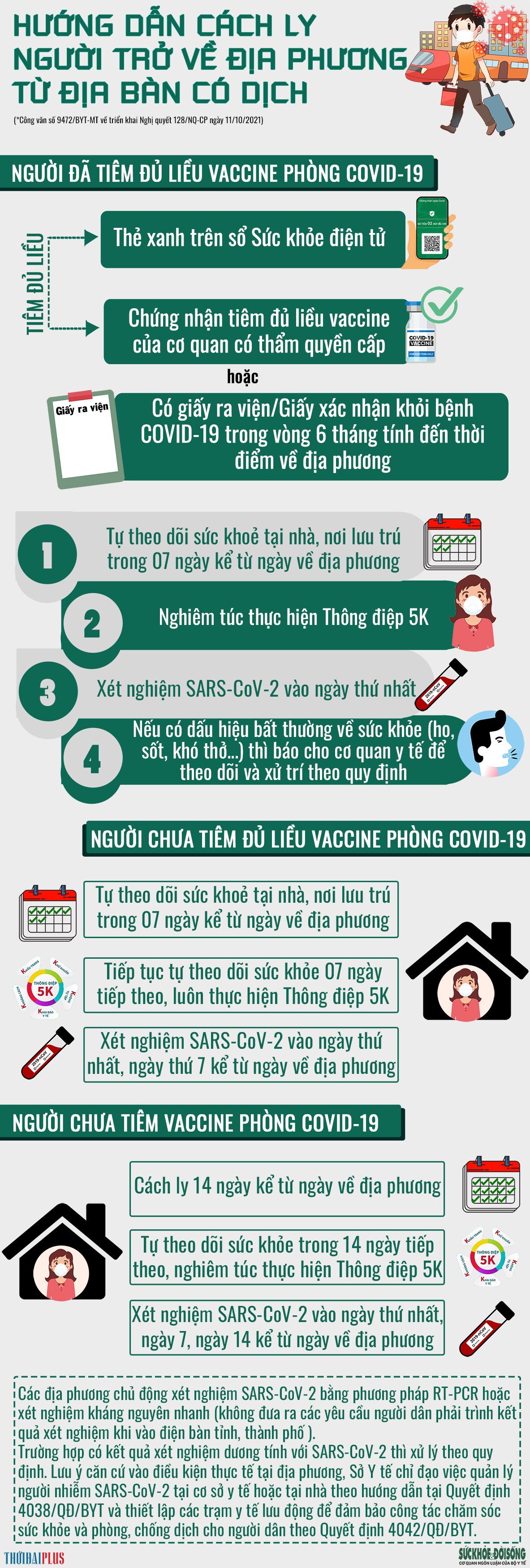 Bộ Y tế yêu cầu những người ở vùng dịch tiêm chưa đủ liều vaccine phòng COVID-19 về địa phương phải thực hiện cách ly tại nhà, nơi lưu trú 7 ngày; tiếp tục tự theo dõi sức khỏe trong 7 ngày tiếp theo và lấy mẫu xét nghiệm 2 lần.