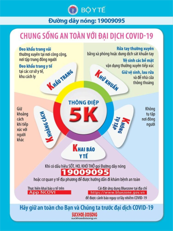 THÔNG ĐIỆP 5K: KHẨU TRANG – KHỬ KHUẨN – KHOẢNG CÁCH – KHÔNG TỤ TẬP – KHAI BÁO Y TẾ gồm: